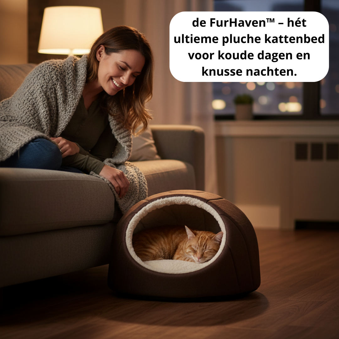 De FurHaven™ is een luxueus pluche katten- en hondenbed, ontworpen als een grotvormig nestje waar huisdieren zich instinctief in terugtrekken.