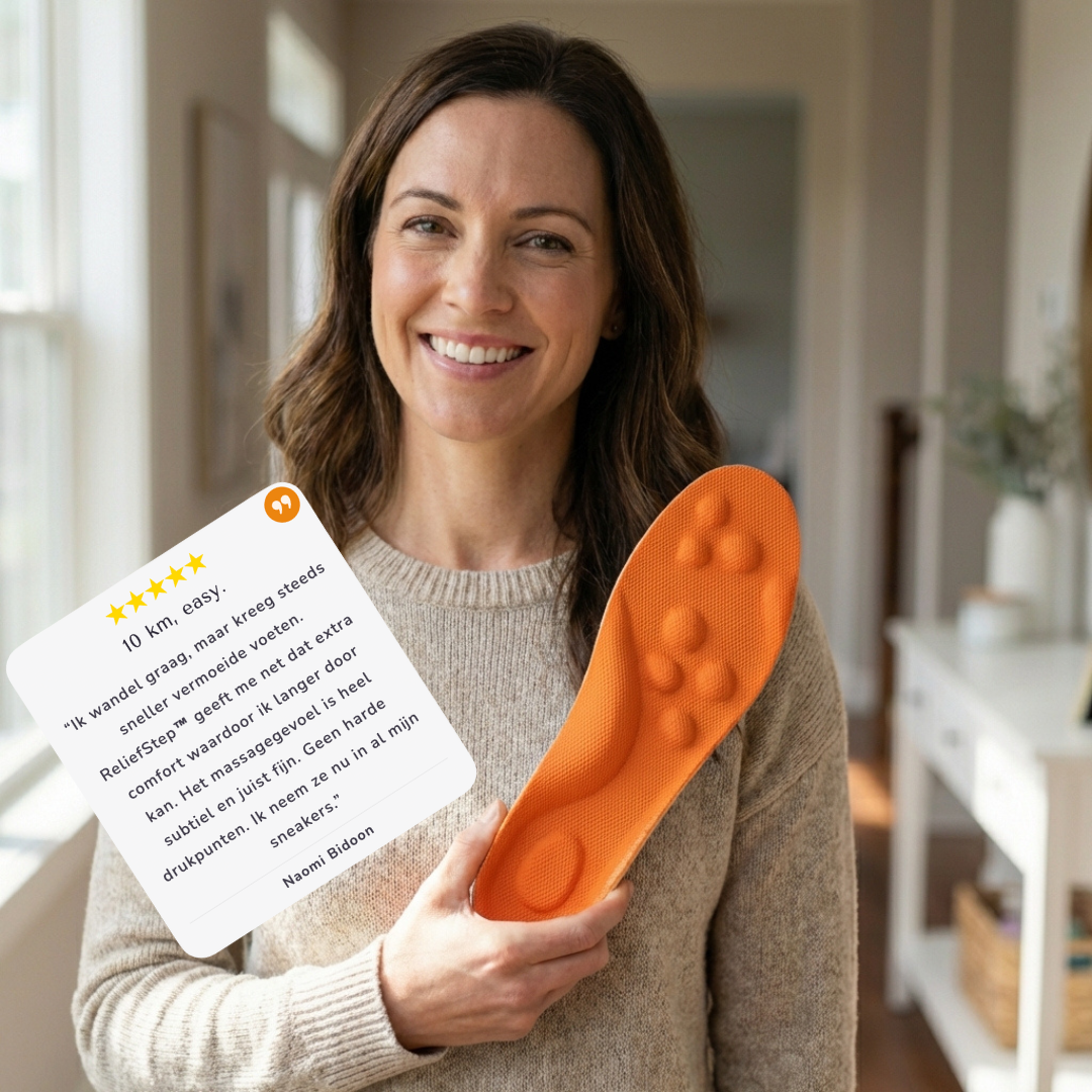 “Wat ik vaak zie, is dat mensen te lang doorlopen met klachten die vooral door druk en impact erger worden. Een goede inlegzool die druk verdeelt en schokken dempt, kan al enorm helpen om de dag comfortabeler door te komen. ReliefStep™ voelt niet hard of ‘correctief’ aan, maar geeft wél ondersteuning op de juiste plekken. Daardoor ervaren veel mensen sneller verlichting in het dagelijks lopen.”